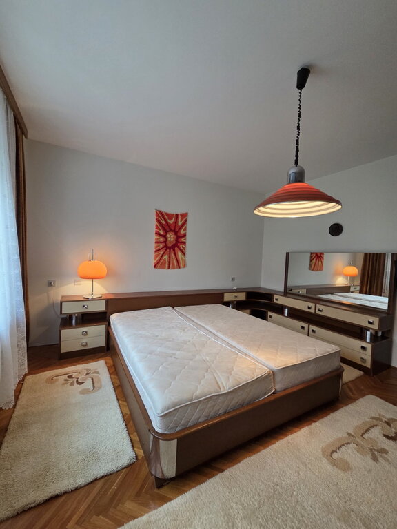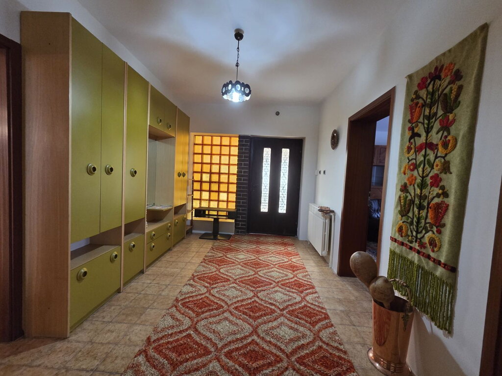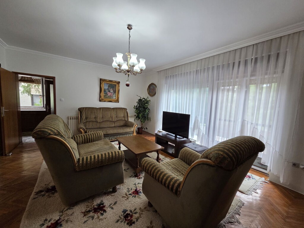 Nedaleko od centra grada izdaje se velika porodična kuća površine 229m2. Sastoji se od velikog dnevnog boravka sa trpezarijom, kuhinje sa špajzom, dve sobe, kupatila i terase duž cele kuće. U dvoištu ima garaža za dva automobila. Na podovima su parket i pločice, prozori su PVC, a grejanje je centralno na gas. Obavezan depozit u visini jedne kirije, minimalni najam 6 meseci za nepušače , bez kućnih ljubimaca.
